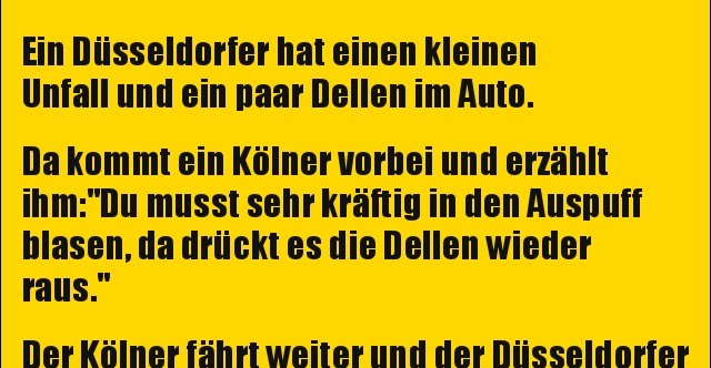 „wat koss mich dat?“ sät der verschrotter: „wenn du im wagen drin blievst, is dat ömesöns.“ 2. Wenn ein düsseldorfer aus dem rhein trinkt Kütt ne düsseldorfer noch kölle und will singe wagen verschrotte losse. Und dann stellten wir fest: